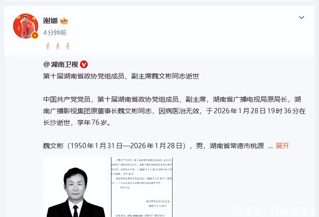 或许有人会说,娱乐博主谈悼念太轻佻,但其实不然。魏老用一生践行“把快乐带给中国人”,他让严肃的电视荧屏变得鲜活有趣,而谢娜则用自己的方式,把这份快乐传递了二十多年[7][10]。这次谢娜的静音悼念,既有晚辈对前辈的敬重,也有“快乐传承者”对“快乐缔造者”的致敬,不煽情、不刻意,却比千言万语更动人。据悉,魏文彬先生因病医治无效,于2026年1月28日在长沙逝世,享年76岁,遗体告别仪式将于1月31日举行[3][8]。愿魏老一路走好,愿他留下的快乐基因,能一直传递下去;也愿我们的太阳女神谢娜,能带着这份传承,继续给大家带来温暖与欢笑,不辜负前辈的期许,也不辜负我们的青春。最后唠一句:那些年守在电视前笑到打滚的日子,那些快本里的名场面,那些谢娜的搞怪瞬间,从来都不是凭空而来。感谢魏老,给了我们一整个青春的快乐;也感谢谢娜,把这份快乐,好好地延续了下去